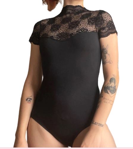 Collant de renda com gola alta, manga curta e gota nas costas